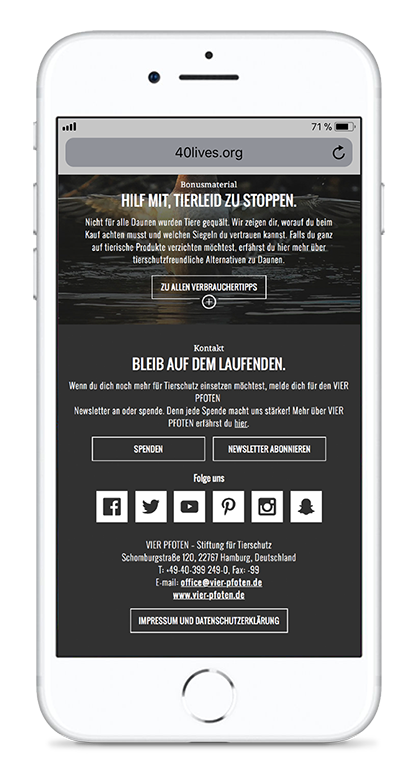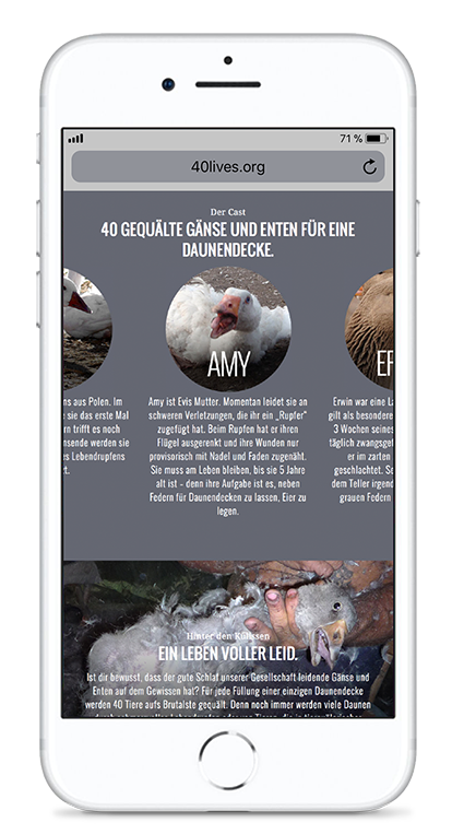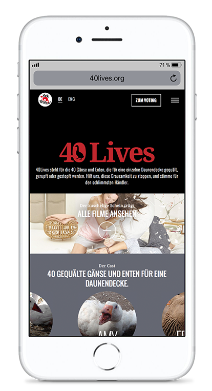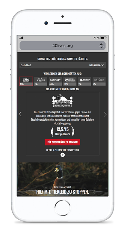 Die Kampagnenfilme und Info-Content wurden in den sozialen Netzwerken geteilt. Alle Werbemittel führten zum Kampagnen-Hub »40Lives.org« auf dem Besucher alles über grausamen Daunenhandel erfuhren und den brutalsten Händler für einen Negativ-Award nominieren konnten.