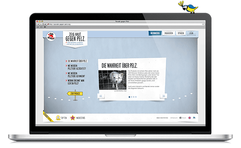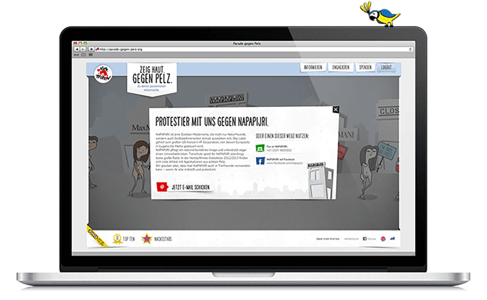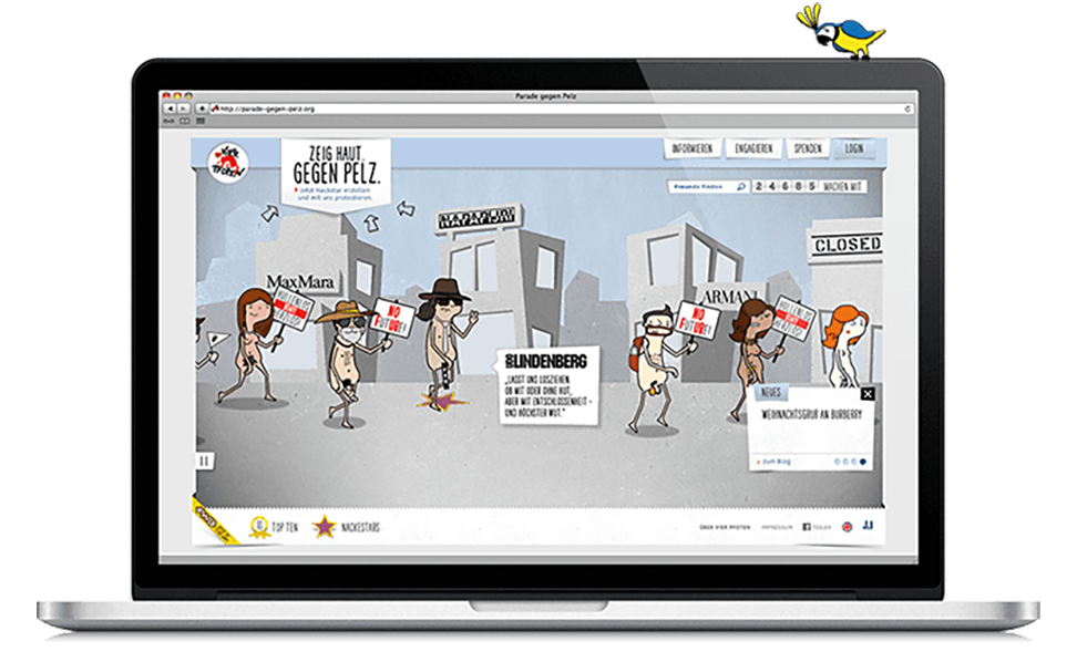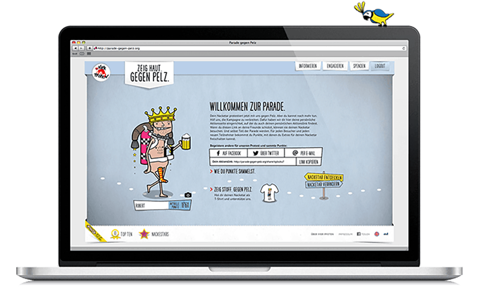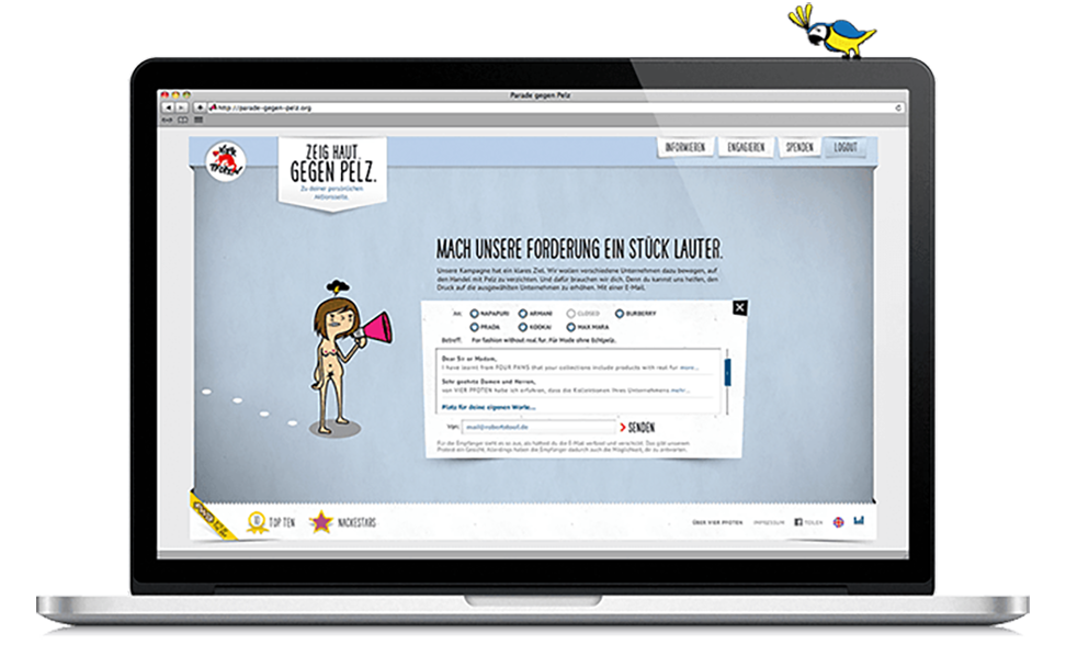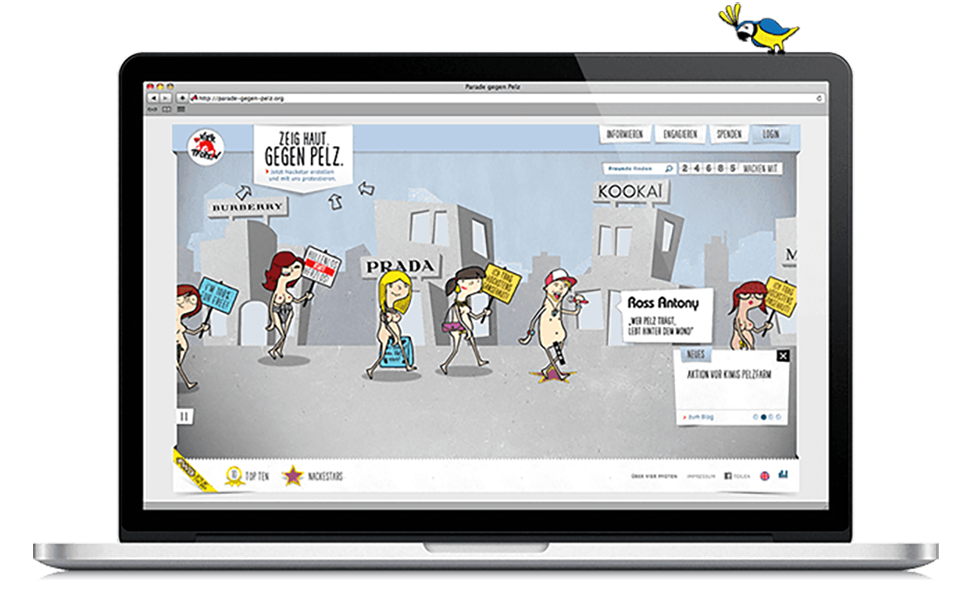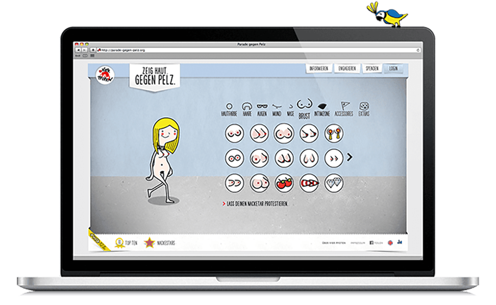 Auf der Website konnte sich jeder in einen ganz individuellen, nackten Avatar – oder kurz: Nacketar – verwandeln und gegen Pelz protestieren. Ganz konkret gegen sieben ausgewählte Unternehmen, die Echtpelz im Sortiment hatten. Wie und warum man den Firmen den Marsch blasen sollte, erfuhr man natürlich ebenfalls hier.
