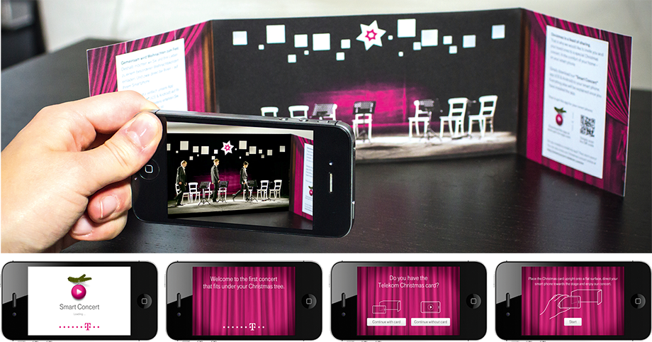 Diese Weihnachtskarte der Telekom war mehr als nur eine Karte – sie war ein Konzert-Ticket. Denn das Bild auf der Innenseite funktionierte als AR-Code. Mit einem Smartphone und einer App konnten die Empfänger das Konzert direkt auf die Karte »projizieren« und sie zum Leben erwecken.