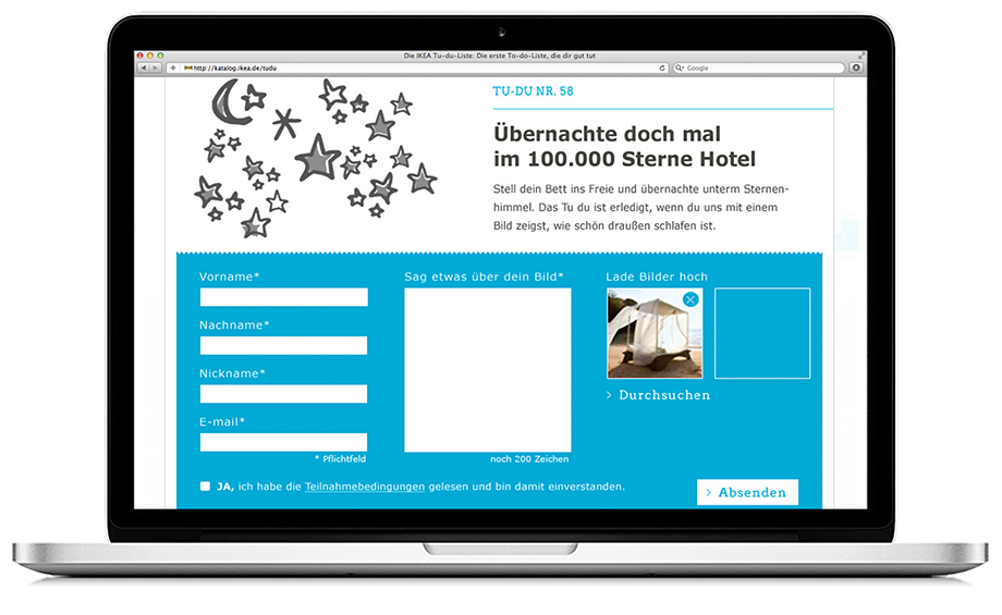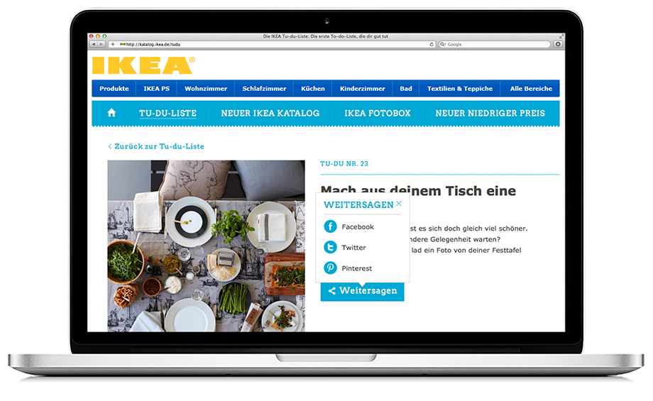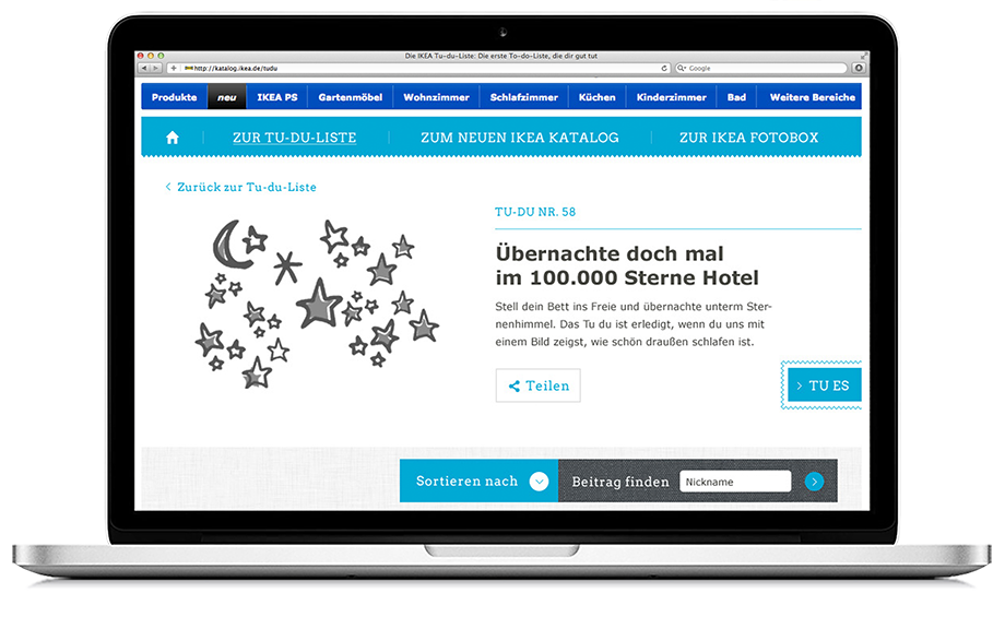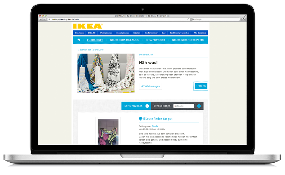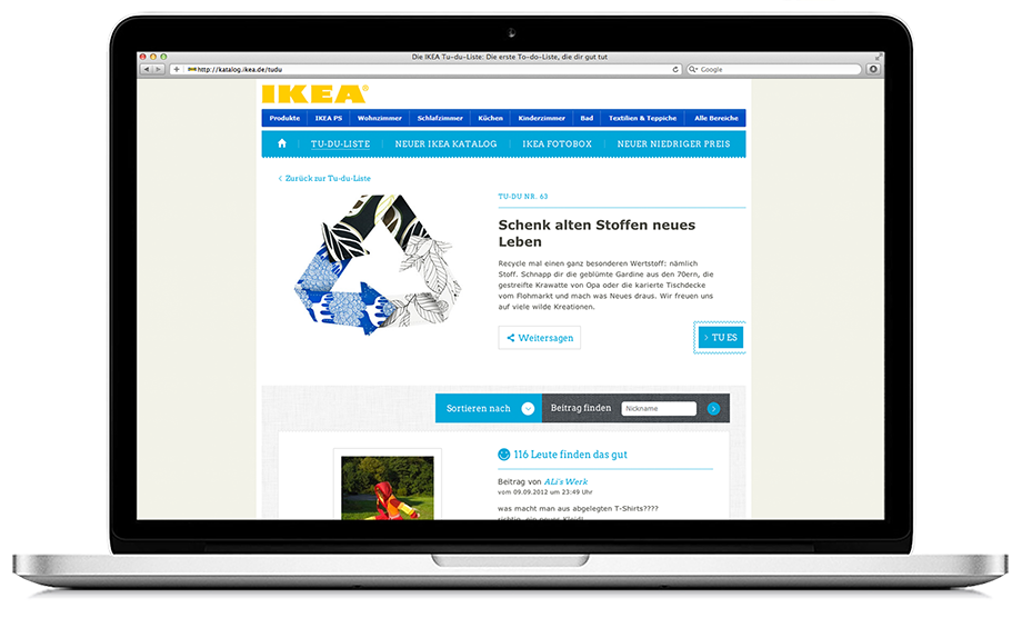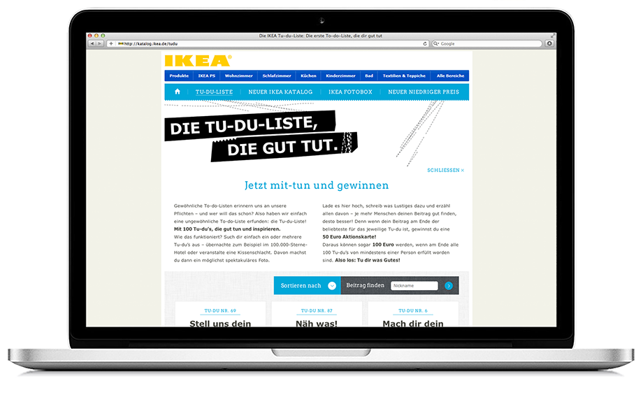 Die Kunden konnten ihre Tu-du’s in sozialen Netzwerken teilen und für sie werben. Wer für seinen Beitrag die meisten „Likes“ bekam, gewann einen IKEA-Einkaufsgutschein im Wert von 50 Euro. Wer gewinnen wollte, musste also schon ein bisschen was tun.
