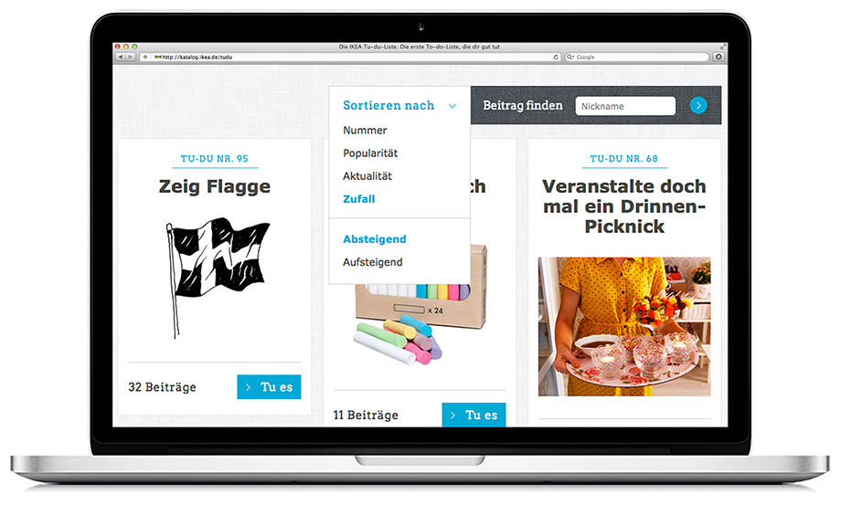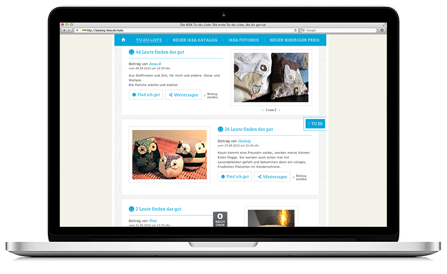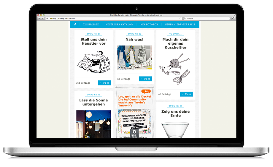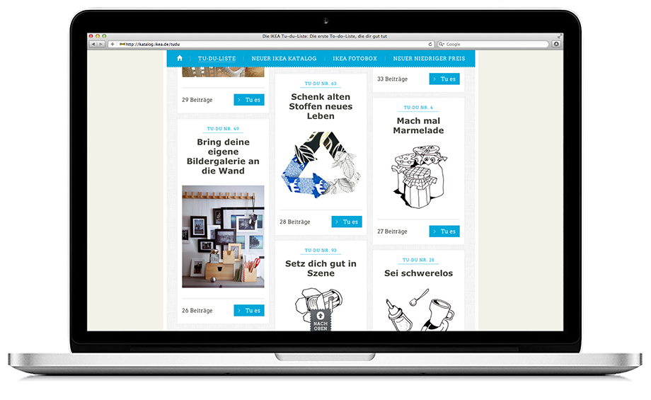 Für die Kampagnenseite entwickelten wir 100 unterschiedlichste Tu-du’s! Es gab Tu-du’s zu den Kernthemen „Textilien“ und „Heimeinrichtung“ und solche, die für Abwechslung und Unterhaltung sorgten. Die Kunden wurden so inspiriert unterschiedliche Tu-du’s auszuprobieren und ihre Erfahrungen, Fotos oder auch eigens entwickelte Tu-du’s hochzuladen, um sie mit allen IKEA Kunden zu teilen.